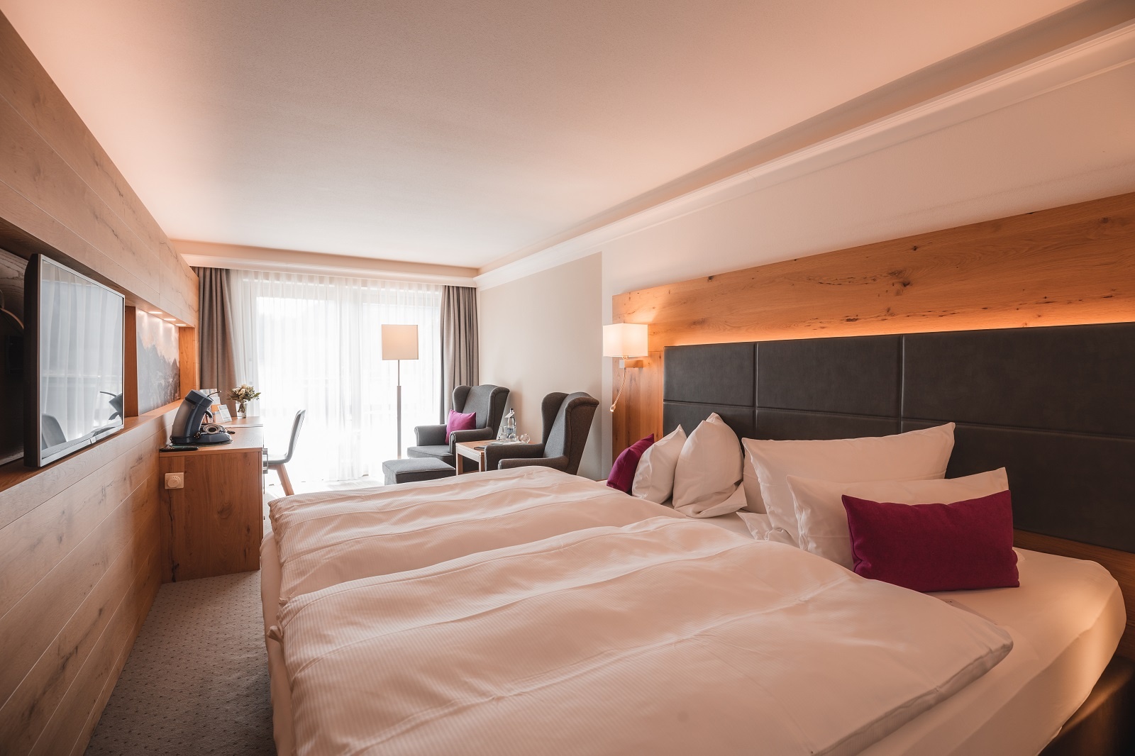 Großzügiges und gemütliches Doppelzimmer mit herrlichem Panormablick in die Oberstdorfer Wiesen und auf die Gipfel des Allgäuer Hauptkamms.
